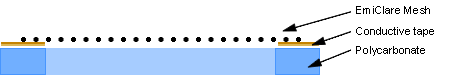 EMI Polycarbonate Shielded mesh display filter windows of ultra thin construction. A low cost filter, short lead-time option for small apertures sealed in enclosure.